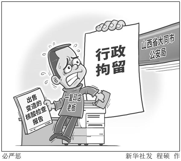 记者1月21日从山西省大同市公安局获悉,该局辖区一复印店出售变造的核酸检查报告11份,获利200元,该复印店老板被行政拘留15日。