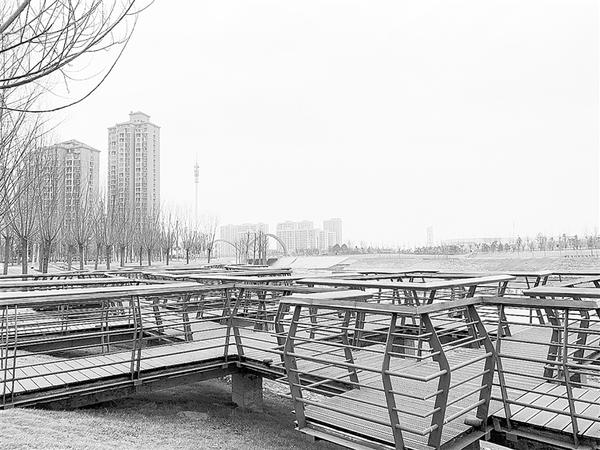 游览至流沙河河道边的玉盘落珠景观段,约160年树龄的市树——国槐屹立在广场上,向东走至亲水平台,站在亲水平台上可近距离观赏河面风景。在河道旁的木栏小道,一位市民正带着孩子游玩。“这里好漂亮,真好玩。”游玩的孩子嬉笑着说。“不仅有广场、亲水平台,前面还有紫竹林、蓝红塑胶跑道等休闲娱乐好去处。玉盘落珠景观段目前也处于管养阶段,春节期间应该会完全开放。”董帅兵说。