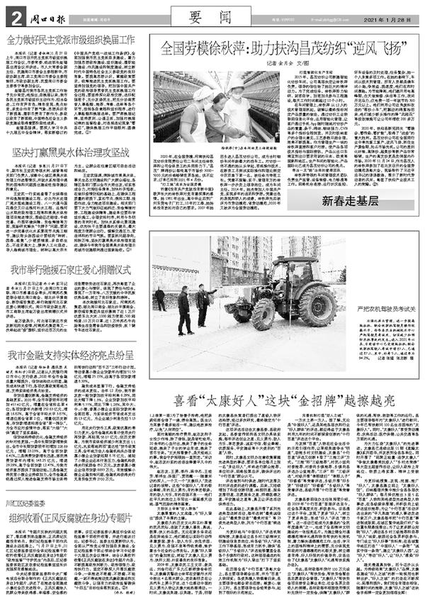 2020年,扶沟县新冠肺炎“零确诊、零传染、零扩散”,取得了“战疫”的重大胜利。昌茂纺织公司在全国同行业中率先复工复产,逆风飞扬,抓住生产黄金期,抢占市场先机。公司的差别化纤维、高弹纱、超柔纱等新产品非常畅销,生产的高支纱更是走俏国内外市场。2020年11月24日,作为昌茂人的徐秋萍参加了在北京召开的全国劳动模范表彰大会,现场聆听了习近平总书记的谆谆教诲,展示了新时代劳动者的风采,彰显了扶沟产业技术工人的荣耀。②5