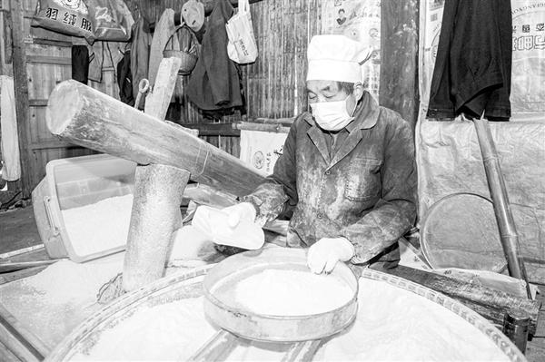 1月28日,工人在水碓旁筛米粉。在浙江省余姚市陆埠镇石门村的山谷中,有一间使用传统水碓制作年糕的作坊。作坊主罗文岳今年58岁,是这间水碓年糕作坊的第三代经营者。新春佳节临近,水碓年糕的生产进入旺季,慕名前来购买的顾客络绎不绝。新华社发