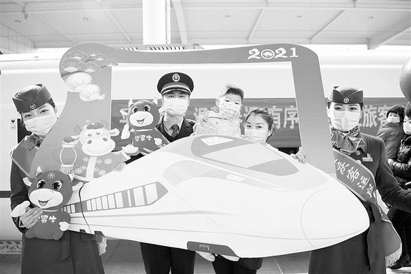 1月28日,乘客与重庆客运段工作人员在发车前合影。当日,2021年春运大幕拉开。2021年春运从1月28日开始,至3月8日结束,共40天。