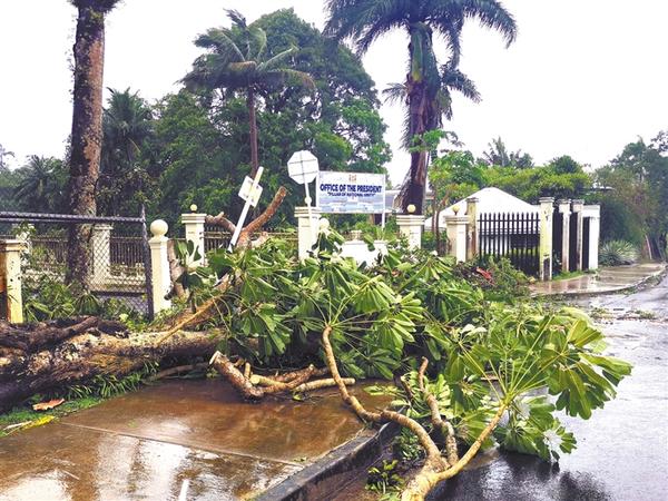 这是1月31日在斐济苏瓦街头拍摄的被吹倒的树枝。2021年第一股热带气旋“安娜”连日来肆虐南太平洋岛国斐济,目前已经造成5人失踪,许多地区发生洪涝灾害,河水暴涨,村庄被淹,交通及水电供应中断,数千人被迫疏散。斐济国家气象局说,靠近热带气旋中心附近的风速高达每小时100公里,最高时可达每小时140公里。新华社记者 张永兴 摄