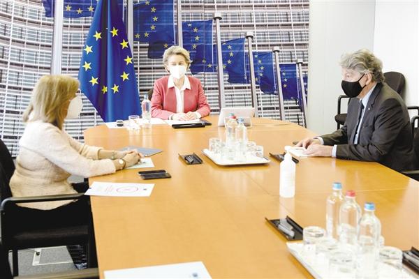 1月31日,欧盟委员会主席冯德莱恩(中)、欧盟委员会负责卫生和食品安全事务的委员基里亚基季斯(左)和负责内部市场的委员布雷东在比利时参加视频会议。欧盟委员会1月31日与多家制药公司代表举行视频会议,讨论了快速开发和生产针对变异新冠病毒的疫苗等问题。新华社发