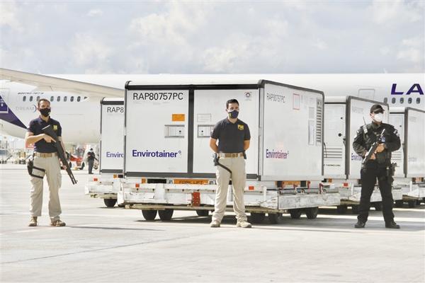 1月31日,第二批中国科兴公司生产的新冠疫苗运抵智利首都圣地亚哥国际机场。第二批中国科兴公司生产的新冠疫苗1月31日运抵智利首都圣地亚哥国际机场。智利卫生部、外交部官员赴机场迎接这批疫苗。新华社发