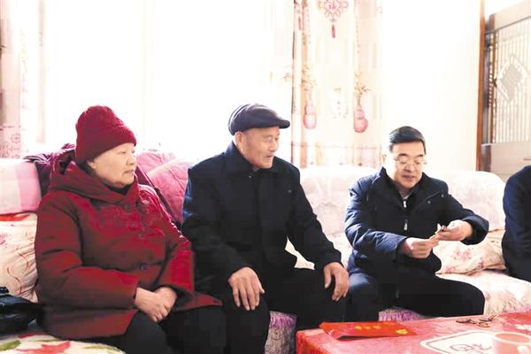 在老党员卜洪贺家中,皇甫立新与他亲切交谈(如图),详细询问他的身体和生活情况,感谢他为党和人民作出的贡献,祝福他身体健康、春节快乐,并为他送去了慰问金和慰问品。