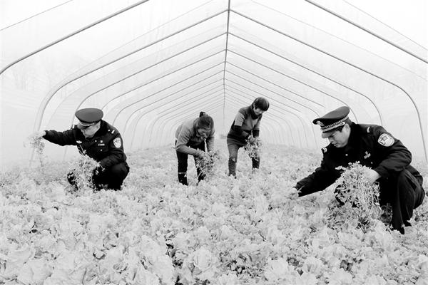 2月1日,商水县公安局平店派出所民警到该乡蔬菜种植园了解贫困户经济收入情况,积极为贫困户出点子、想办法,争取让贫困户早日脱贫。图为民警帮助贫困户拔草。