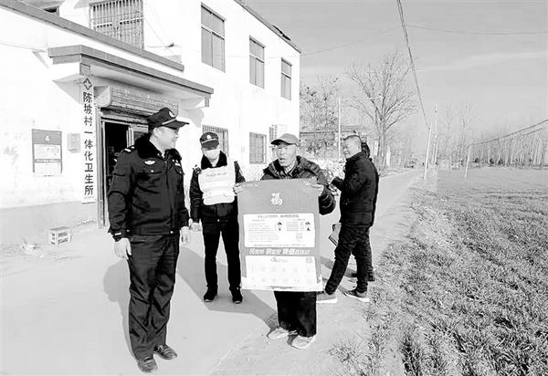 为增强广大群众的安全防范意识,进一步提升群众的安全感和满意度,2月4日,商水县公安局组织民警、辅警把印有安全防范常识的“平安福”送到辖区农家,并向群众宣传安全防范知识。图为该县郝岗派出所向陈坡村群众介绍冬季防盗、防火、防煤气、防诈骗安全知识。 记者 侯国防 通讯员 郭利军 摄