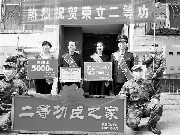 一张小小的喜报,背后是官兵付出的辛勤汗水,承载的是官兵视之高于生命的军人荣誉。图为2月5日,川汇区军地联合为武警周口支队二等功臣曹一凡、三等功臣张勇送立功喜报。
