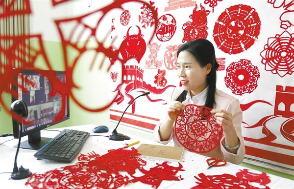 2月7日,河北省邢台市第三中学附属小学的老师通过网络向学生展示剪纸作品。