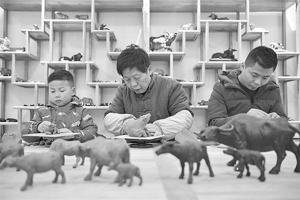 2月9日,在贵州省遵义市余庆县,72岁的民间泥塑艺人黄泽富(中)正忙着制作泥牛,迎接新春的到来。黄泽富从事泥塑工艺50余年,被称为“泥牛黄”。“泥牛黄”泥塑是贵州省六个特色文化产品之一,2019年被列入贵州省第五批省级非物质文化遗产名录。