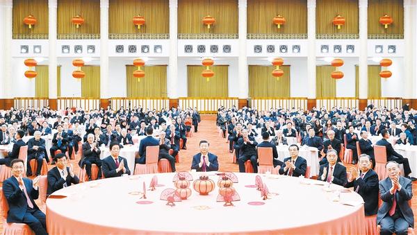 人民大会堂宴会厅灯光璀璨、暖意融融,各界人士约1000人欢聚一堂、共迎新春,欢声笑语间洋溢着喜庆祥和的节日气氛。
