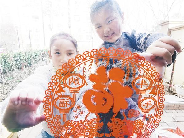 2月11日,小朋友在窗户上贴窗花。