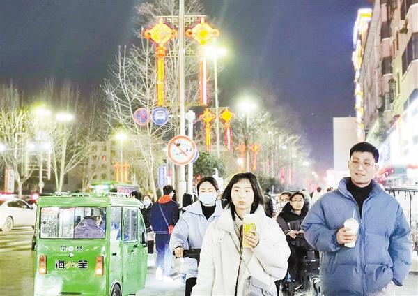 为给大家营造愉悦、喜庆、欢乐的节日氛围,中心城区七一路挂上了中国结造型的彩灯,两边的商店也在门口挂起了各种红灯笼。夜幕降临后,红彤彤的灯笼亮起来,街道变得绚丽多彩,年味十足。