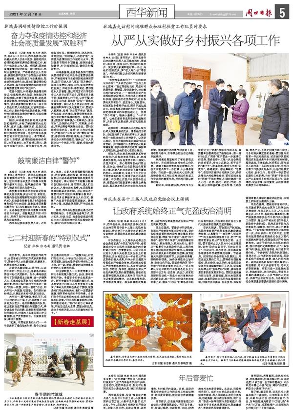 本报讯 (记者 张猛 张志新 通讯员 胡新生) 2月8日,西华县委书记林鸿嘉先后深入该县中医院、县新冠肺炎疫情防控指挥部调研疫情防控工作,慰问一线防疫工作人员。他强调,要始终紧绷疫情防控这根弦,做好常态化、机制化疫情防控,严格落实返乡人员排查、核酸检测和发热门诊预检分诊等制度性措施,推动防疫工作由遭遇战、阻击战转变成持久战,坚决打赢疫情防控人民战争,奋力夺取疫情防控和经济社会高质量发展目标“双胜利”。