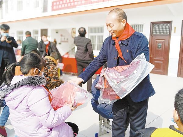 春节前夕,周口市第四届人大代表、周口凯盛实业有限公司董事长方凯自掏腰包6万余元,购买了164套新校服捐赠给西华县艾岗乡半截楼小学的学生。记者 张猛 张志新 摄