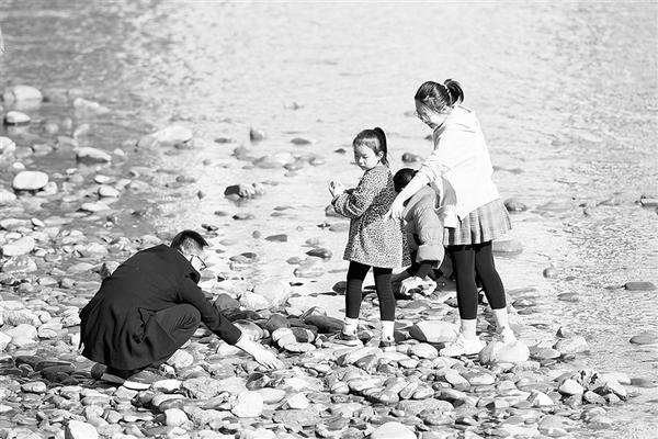 2月18日,市民带着孩子在黄河兰州段河床上捡石头。近日,受黄河上游来水量较少等因素影响,黄河兰州段水位持续下降,部分河床裸露,又恰逢气温回暖,众多市民带着孩子来到黄河边休闲游玩。新华社发