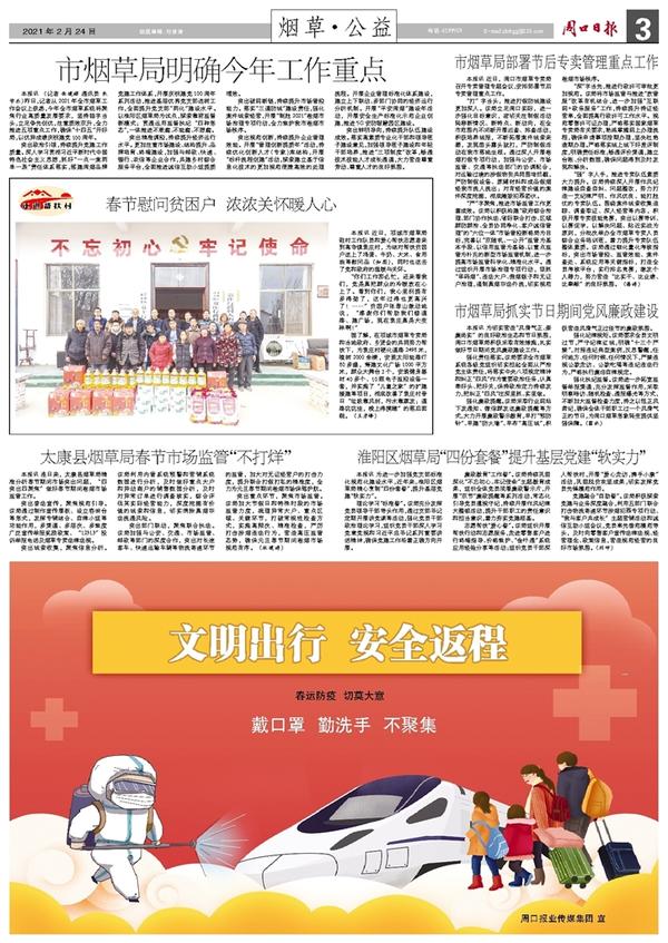 本报讯 (记者 岳建辉 通讯员 朱学杰)昨日,记者从2021年全市烟草工作会议上获悉,今年全市烟草系统将聚焦行业高质量发展要求,坚持稳字当头,立足争先创优,注重质效双升,全力推进五项重点工作,确保“十四五”开好局,以优异成绩庆祝建党100周年。