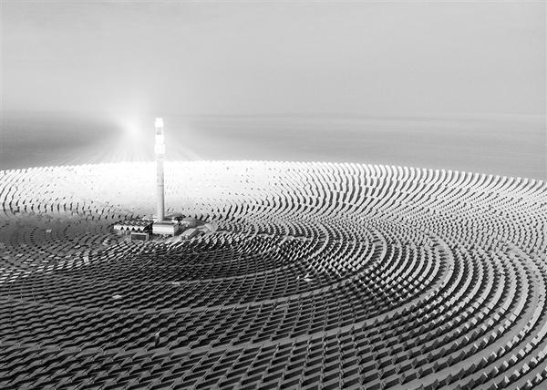 在甘肃省敦煌市向西约20公里处,被称为“超级镜子发电站”的首航高科敦煌100兆瓦熔盐塔式光热电站在戈壁滩上闪耀。电站内的1.2万多面定日镜以同心圆状围绕着260米高的吸热塔,镜场总反射面积达140多万平方米,设计年发电量达3.9亿千瓦时,每年可减排二氧化碳35万吨,是我国目前建成规模最大、吸热塔最高、可24小时连续发电的100兆瓦级熔盐塔式光热电站。新华社记者 马希平 摄