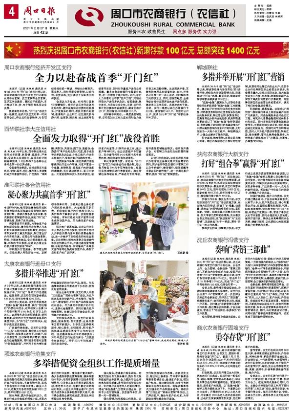 本报讯(孙北平)自“开门红”活动开展以来,郸城联社辖内各信用社(部)多措并举,持续加大存贷款营销力度,迅速掀起“开门红”热潮。截至目前,郸城联社各项存款余额突破170亿元。