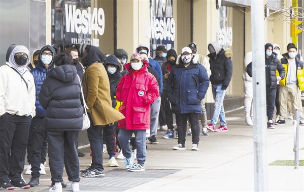 3月8日,在加拿大多伦多,戴口罩的顾客在一家商店外排队等候。