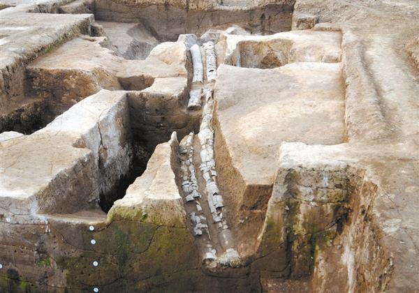 其中,考古学家最早发现的是南城门“门卫房”通道下的一组陶排水管。这组陶排水管和沟渠位于南门门道的路面之下。首先在门道下挖一条城内高城外低并且上宽下窄的沟渠,然后在沟底铺一条节节相套的陶排水管道,其上再并列铺设两条同样规格的陶排水管道,形成一个“倒品字形”的管道组合,然后用料礓石(就是黄土中自然形成的钙质结核)和土将沟渠和陶管道填埋起来,上面再铺设掺和了小石子和碎陶片的进出城门的路面。