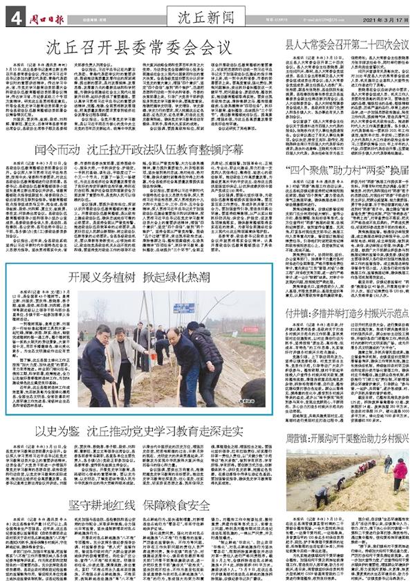 本报讯 (记者 韦伟 通讯员 柳柯) 3月10日,沈丘县委书记皇甫立新主持召开县委常委会会议,传达学习习近平总书记参加内蒙古代表团、青海代表团审议时的重要讲话精神,传达学习中央、省、市党史学习教育动员部署大会和政法队伍教育整顿动员部署会议精神,传达学习省、市纪委系统三个专项方案精神,研究沈丘县贯彻落实意见,听取全县党史学习教育动员部署大会和全县政法队伍教育整顿动员部署会议筹备情况汇报。