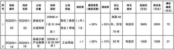 备注:SQ2021-03号:1.宗地“五通一平”(宗地外通路、通电、通讯、通上水、通下水,宗地内土地平整)。2.停车泊位指标:机动车:住宅≥2个/户、1个/100㎡商业建筑面积,非机动车:2个/户。3、沿兆丰大道禁止建设单开间式商业门面用房。4.由辖区政府负责按时向受让人交付土地。 SQ2021-19号:1.宗地“五通一平”(宗地外通路、通电、通讯、通上水、通下水,宗地内土地平整)。2.由辖区政府负责按时向受让人交付土地。3.准入行业:建材制造业。