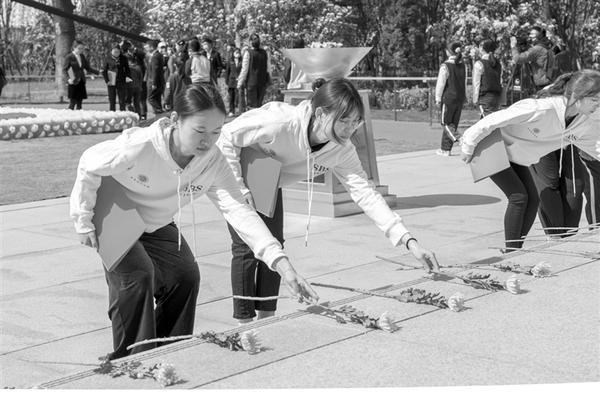 4月4日,参加祭扫活动的学生在龙华革命烈士纪念地献花。