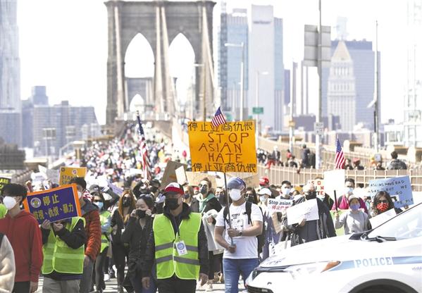4月4日,在美国纽约布鲁克林大桥,人们参加游行反对亚裔仇恨。当天,大量示威者在美国纽约举行主题为“停止仇恨犯罪、反对种族歧视、捍卫亚裔权益”的大型集会游行活动。新华社记者 王迎 摄