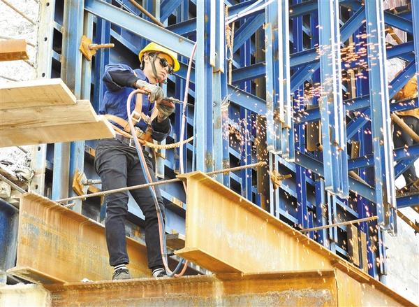 4月6日,在七一路跨沙颍河大桥工程现场,工人正在施工。七一路跨沙颍河大桥是周口中心城区跨度最大的桥梁,主桥采用悬索桥组合结构。本工程完工后将给周口市民的通行带来极大的便利。 记者孙安平 摄