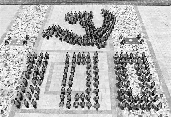 近日,扶沟县各中小学、幼儿园立足教育实际,创新形式,丰富载体,开展了形式多样的党史学习教育活动。图为扶沟县城关镇回族小学300多名学生,排列成党徽形状和100字样,庆祝中国共产党成立100周年。 记者 刘华志 摄