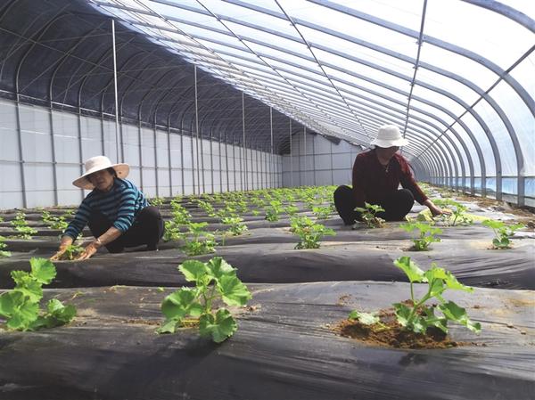 今年,在省委宣传部驻西华县艾岗乡半截楼村第一书记马本胜帮扶下,为半截楼村争取资金100 万元,建造7个标准温室大棚发展高效农业。图为瓜农正在打理吊秧香瓜。 记者 张猛 张志新 摄