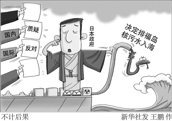 无视国内国际舆论的质疑和反对,日本政府4月13日召开有关内阁会议正式决定将福岛第一核电站上百万吨核污水经过滤并稀释后排入大海,排放将于约2年后开始。新华社发 王鹏 作