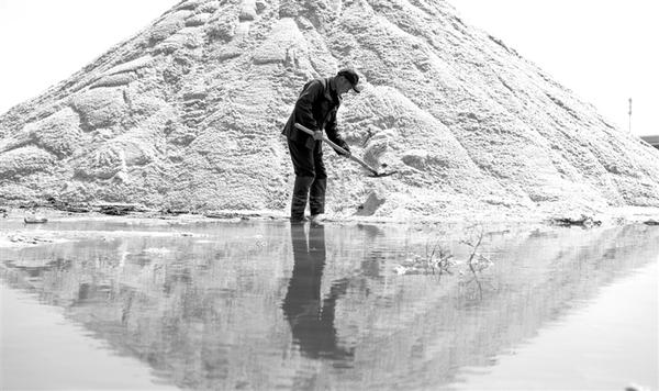 4月19日,在河北省黄骅市前沙盐场,工人在整理盐垛。时下,全国著名的海盐产区河北省黄骅市开始春季扒盐工作,工人们利用晴好天气加紧收获春盐。新华社记者 骆学峰 摄