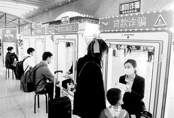 4月30日,民警(右一)在“屏幕”后模拟“骗子”,考验旅客对电信诈骗犯罪的防范意识。“五一”小长假到来之际,石家庄铁路公安处在石家庄站候车室开展“防诈骗大讲堂”活动,通过沉浸体验、案例讲解和互动课堂等多种形式,提升旅客防范电信诈骗意识,保护财产安全。新华社发