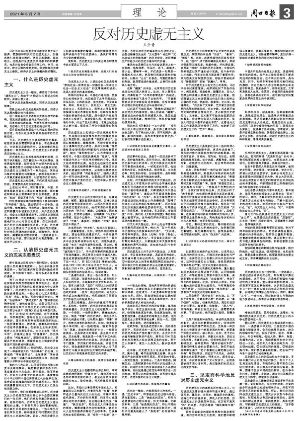 理论工作队伍既是对历史虚无主义作战“生力军”,也是提供史实论据的“后勤部”,在主动“亮剑”迎敌的同时,还要教育引导群众,澄清错误认识。