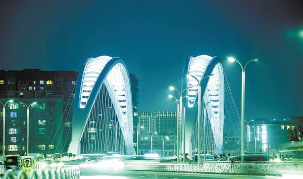 经过工人们的连日安装,周口中心城区试通车的中原路跨沙颍河大桥迎来亮灯。桥上亮起灯光的两片拱肋,宛如两轮月亮,横亘在沙颍河上,有小武汉之称的周口呈现“明月照古城”美景。 记者 梁照曾 摄