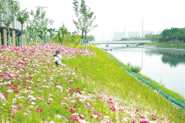 5月10日,周口市中心城区幸福河畔五颜六色的大波斯菊花开正艳,随风摇曳。在阳光的照耀下,河面波光粼粼,岸边树木、绿草和盛开的大波斯菊,勾勒出一幅美丽的田园画。