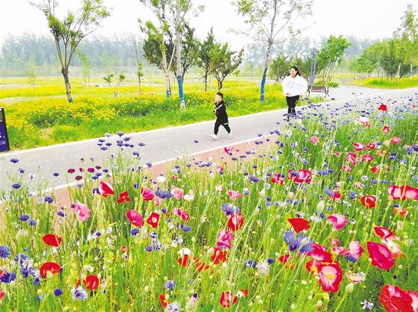 昨天上午,周口市中心城区沙河湾湿地公园内,百花争艳,碧波荡漾,尽显生态之美。图为一对母子正在公园游玩。记者 王映 摄