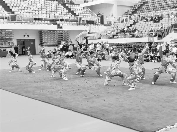 为传承中华武术文化,振奋民族精神,5月9日上午,周口市回民小学参加周口市“全民健身月”武术展演赛。图为该校学生正在展示国家级非物质文化遗产代表项目心意六合拳段位套路。 记者 王珂 摄