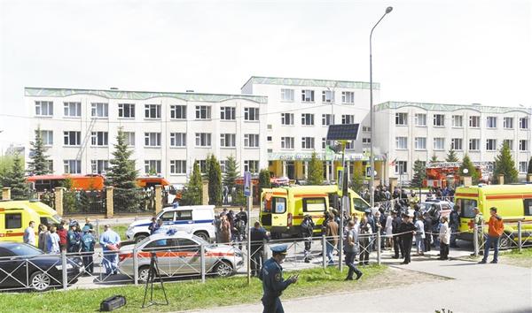 5月11日,警察和救援人员聚集在俄罗斯喀山市发生枪击事件的学校外。 据报道,俄罗斯喀山市一所学校11日发生枪击事件,造成至少9人死亡、10人受伤。新华社发