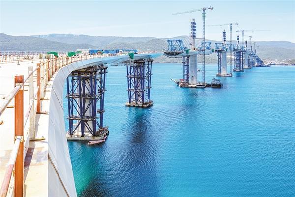 这是5月10日在克罗地亚南部的科马尔纳村附近拍摄的大桥施工现场。 佩列沙茨跨海大桥项目由中国路桥公司牵头的中国企业联合体于2018年中标后开工,大桥设计总长2440米,建成后将横跨亚得里亚海小斯通湾,连接隔海相望的克罗地亚领土。目前该项目的施工进度稳步推进。新华社发