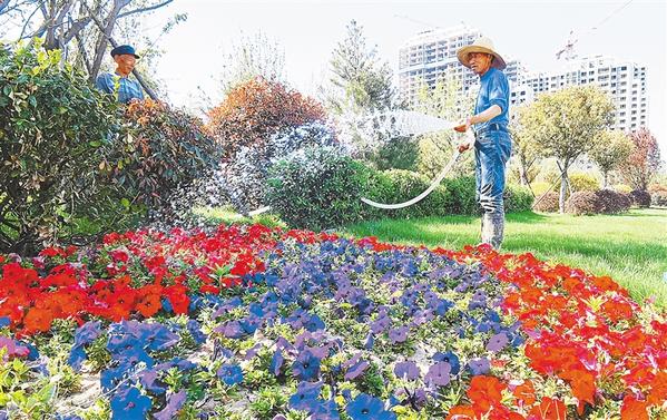 五月的周口中心城区,处处是碧水、蓝天、白云、绿树的生态美景,靓丽的城市环境可圈可点。持续打造宜人宜居美好环境,除了政府部门采取的有效措施外,还离不开兢兢业业、任劳任怨的城市维护工作人员。他们不畏严寒酷暑,用双手和汗水助力城市发展,为我们打造了美丽家园。图为工作人员正在为盛开的鲜花浇水。