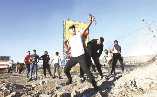 ① 5月15日,巴勒斯坦人在约旦河西岸城市纳布卢斯附近向以色列士兵投掷石块。