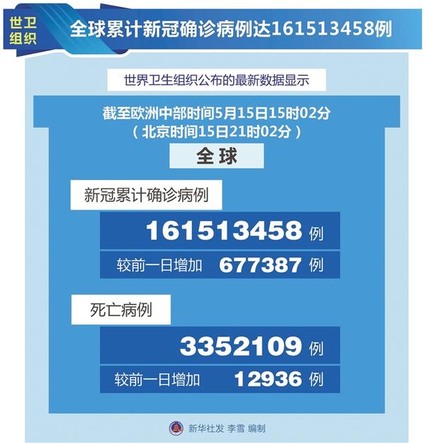 世卫组织:全球累计新冠确诊病例达161513458例