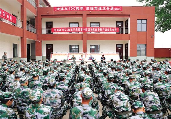 本报讯 (记者 徐松 文/图)5月13日,郸城县2021年基干民兵集中轮训与常态备勤动员会召开。县委常委、常务副县长胡友涛出席会议并讲话,县人武部部长董连江作动员讲话,县退役军人事务局局长褚章民带队现场慰问,县委常委、县人武部政委金仁旺主持动员会。