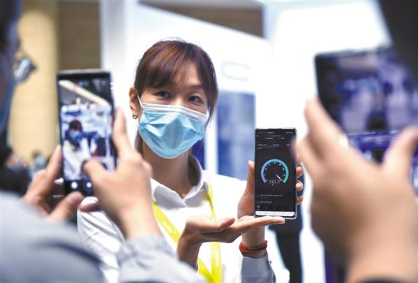 5月17日,工作人员在大会上用手机展示5G网络速度。当日,2021世界电信和信息社会日大会在河南省郑州市开幕。本届大会以“在充满挑战的时代加速数字化转型”为主题,为期两天,会议及展区规模超过1200平方米,预计参会规模超过2000人。新华社记者 李嘉南 摄
