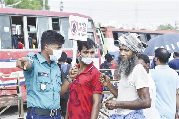 5月17日,警察在孟加拉国首都达卡的车站手举佩戴口罩的提示牌,要求从各地返回达卡的人们注意防护安全。开斋节假期过后,孟加拉国面临人流返程高峰,大批返乡过节的人员返回达卡等大城市。新华社发