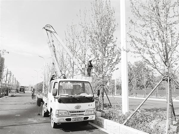 5月19日,记者在周口市中心城区中原路上看到,绿化工人正在对绿化带内行道树的枝条进行修剪、整型,有效提升了街道整体绿化环境。 记者 张洪涛 摄