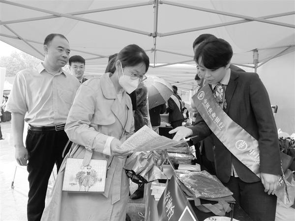 图一:近日,农行周口分行在五一文化广场开展打击和防范经济犯罪宣传活动。该行员工通过设立宣传点,向群众发放宣传折页,讲解人民币防伪知识点等金融知识,提升了广大群众的反假货币技能,树立了农行在社会公众心中的良好形象。图为该行相关负责人为群众答疑解惑。
